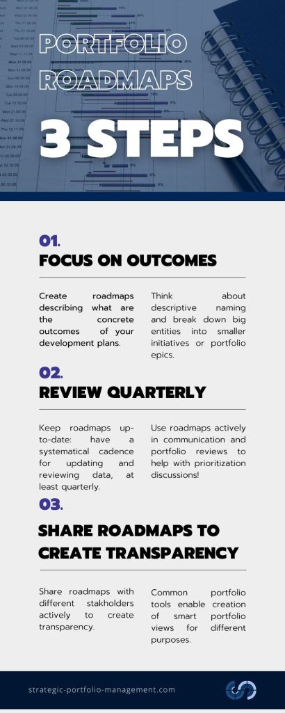 If you have possibility to use the same set of tools within company – managing work from different projects or areas may become easier for the individual, when all tasks can be found from the same tool. The same applies also for the portfolio level – especially for agile development, creating transparency on progress of roadmap items is crucial. Many portfolio management tools today enable integration or have great inbuilt functionalities for managing backlogs.